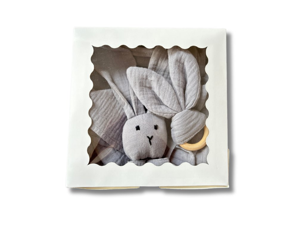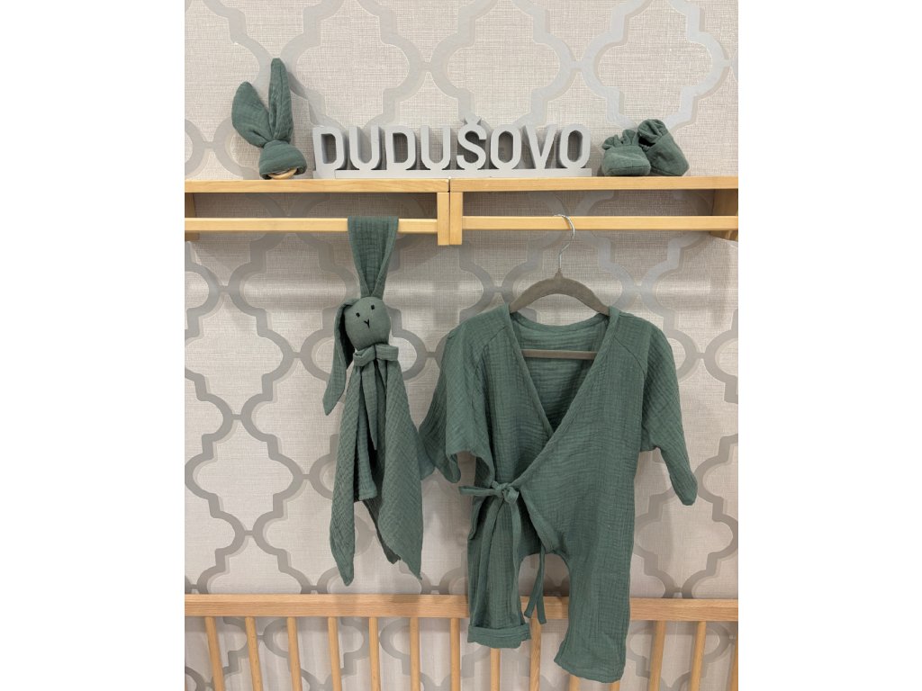 Krásny a funkčný mušelínový set v rovnakej farbe podľa Vášho výberu kimono, papučky, drevené hryzadlo s uškami a mojkáčik Zajko, ktorý prinesie bábätku pokojné noci a pocit bezpečia.