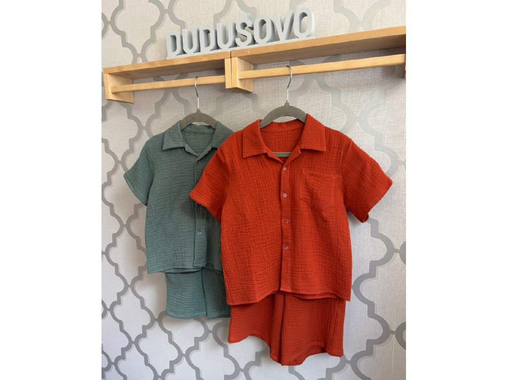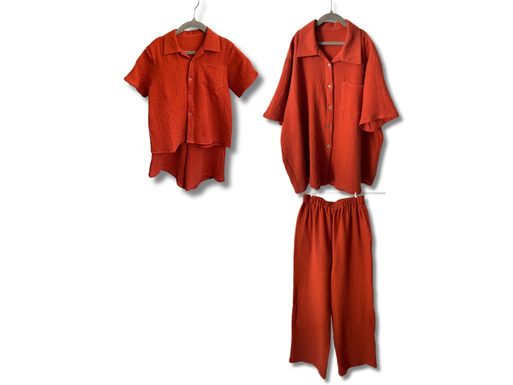 Štýlový set - mušelínová košeľa a nohavice pre mamu a mušelínová košeľa a kraťasy pre dieťatko. Sú vyrobené zo 100 % priedušnej mušelínovej bavlny, ktorá je mimoriadne mäkká, šetrná k pokožke a ideálna na teplé dni.