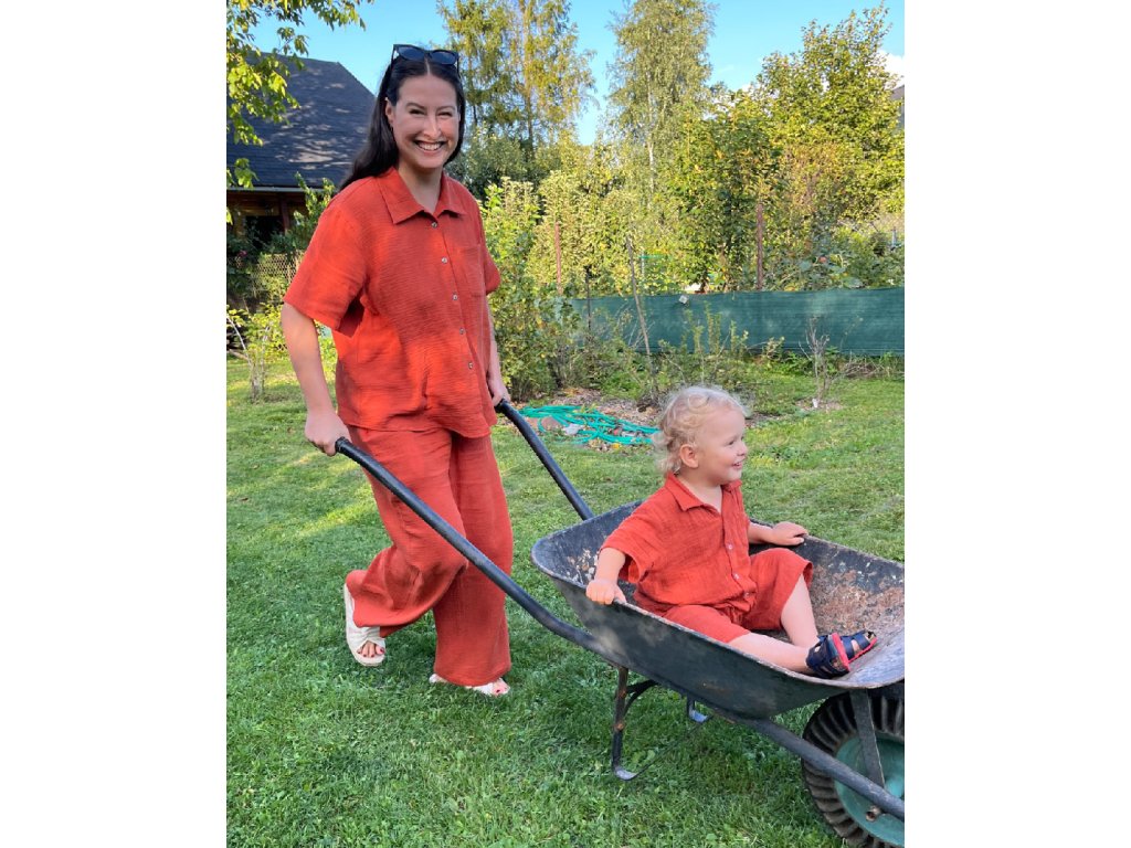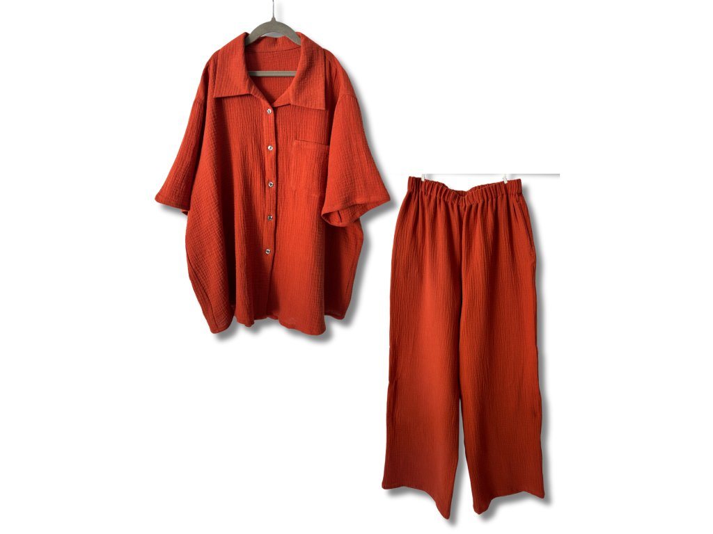 Štýlový set - dámska mušelínová košeľa a nohavice. Sú vyrobené zo 100 % priedušnej mušelínovej bavlny, ktorá je mimoriadne mäkká, šetrná k pokožke a ideálna na teplé dni.