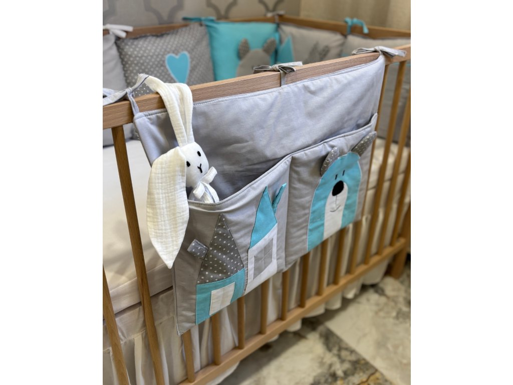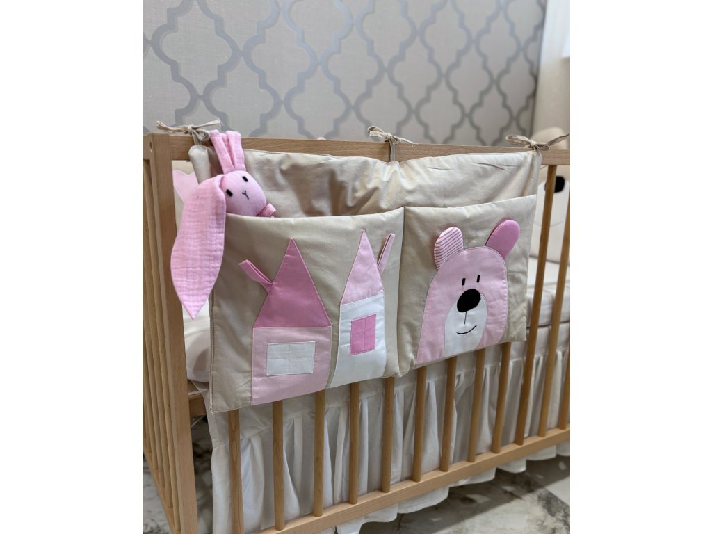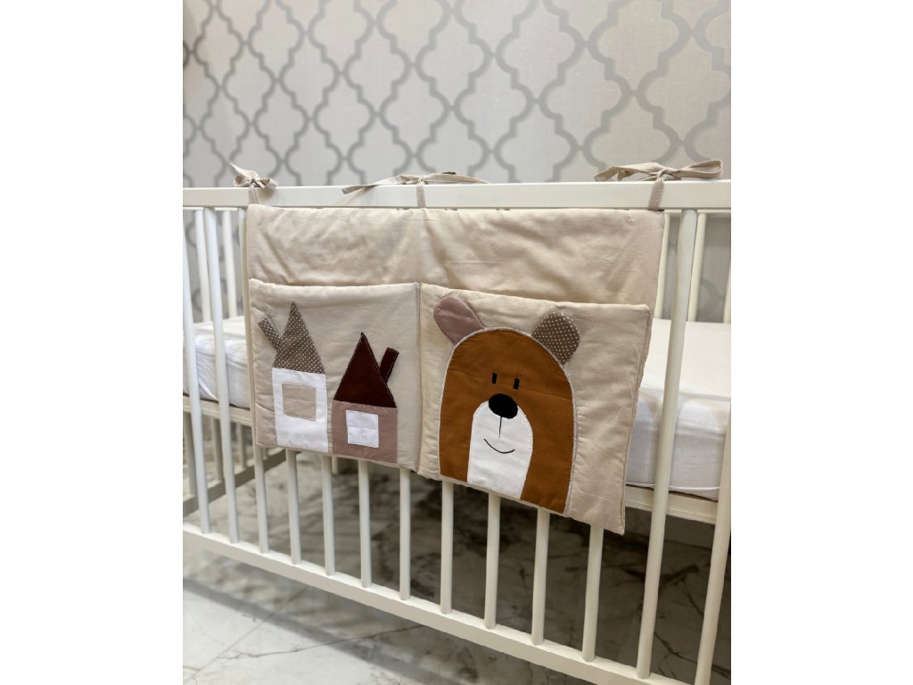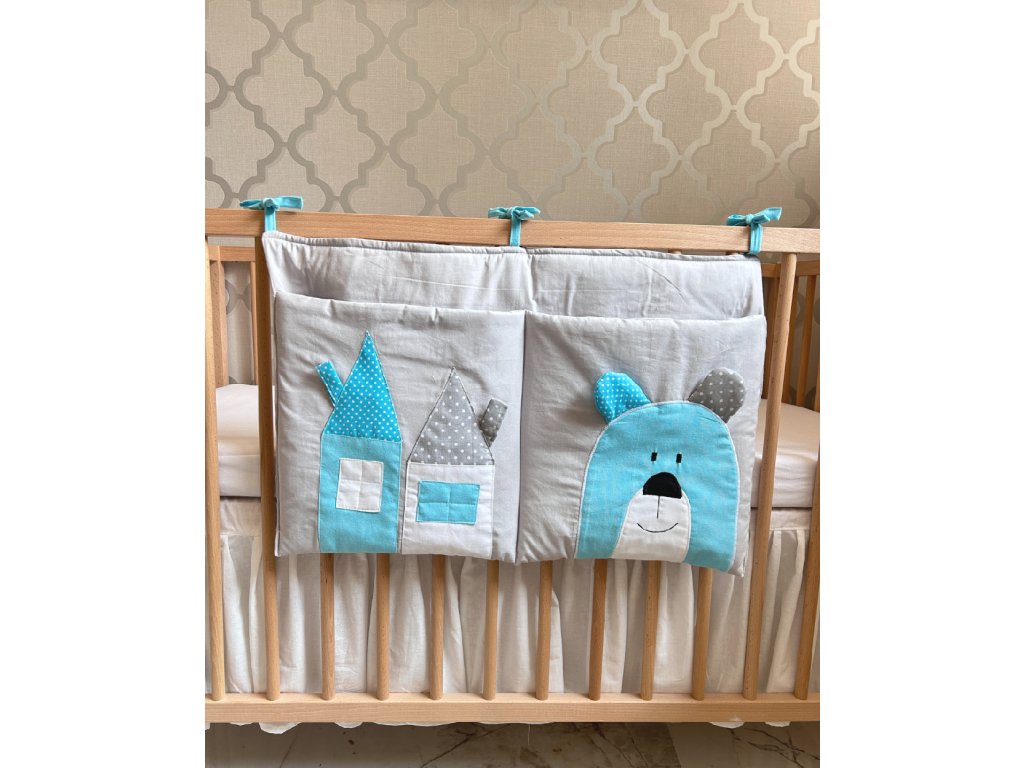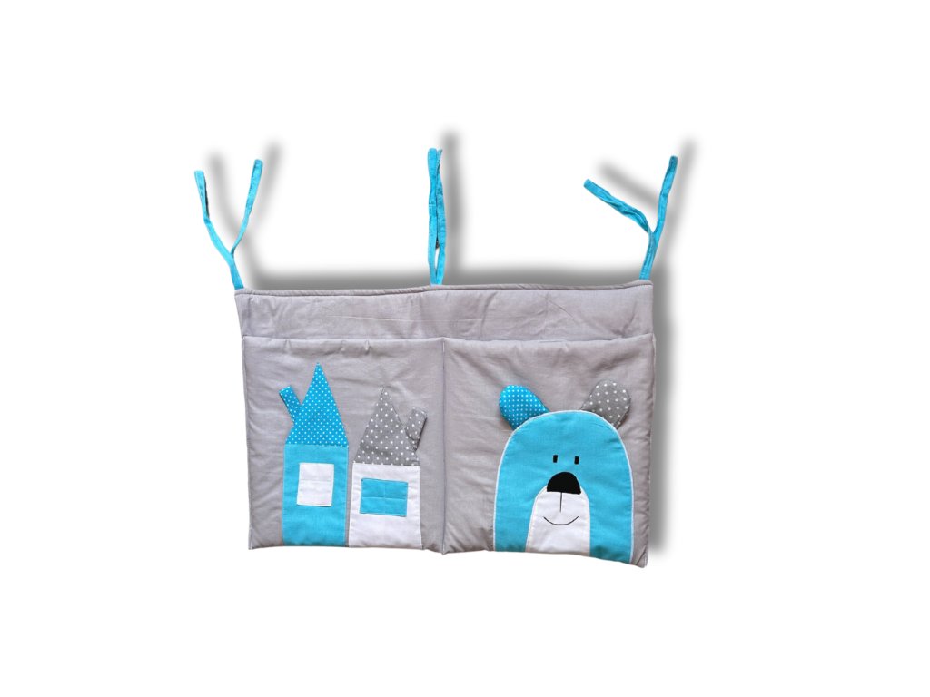 Organizér na postieľku zo 100% bavlny. Praktický doplnok na uloženie všetkých potrebných drobností pre bábätko.