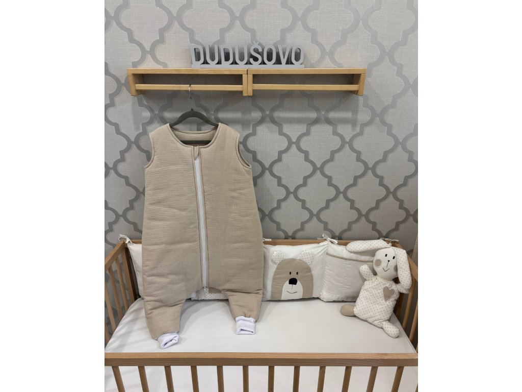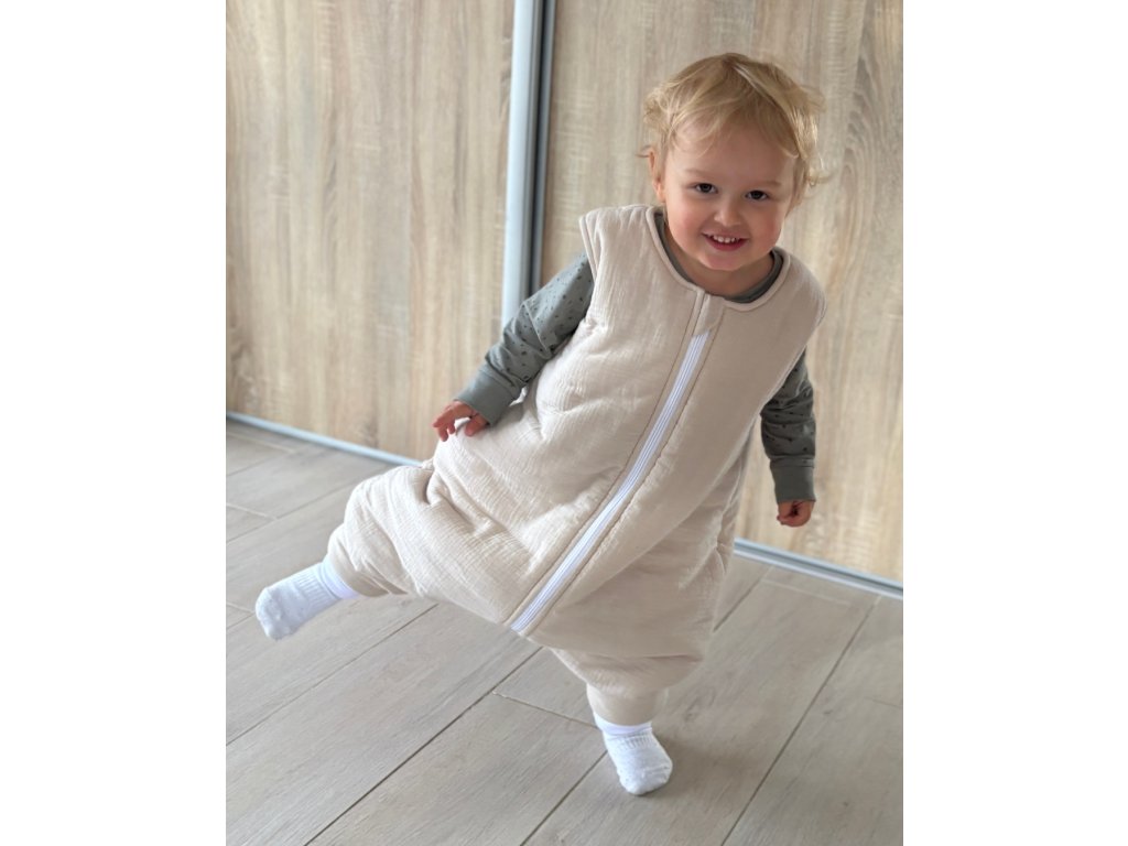 Tento mäkký, hrejivý a zároveň priedušný vak je vyrobený z dvoch vrstiev 100 % mušelínovej bavlny, medzi ktorými sa nachádza jemný hrejivý vatelín. Vďaka tejto trojvrstvovej štruktúre poskytuje ideálny tepelný komfort počas chladných nocí – vaše bábätko zostane v teple, ale bez prehriatia.
